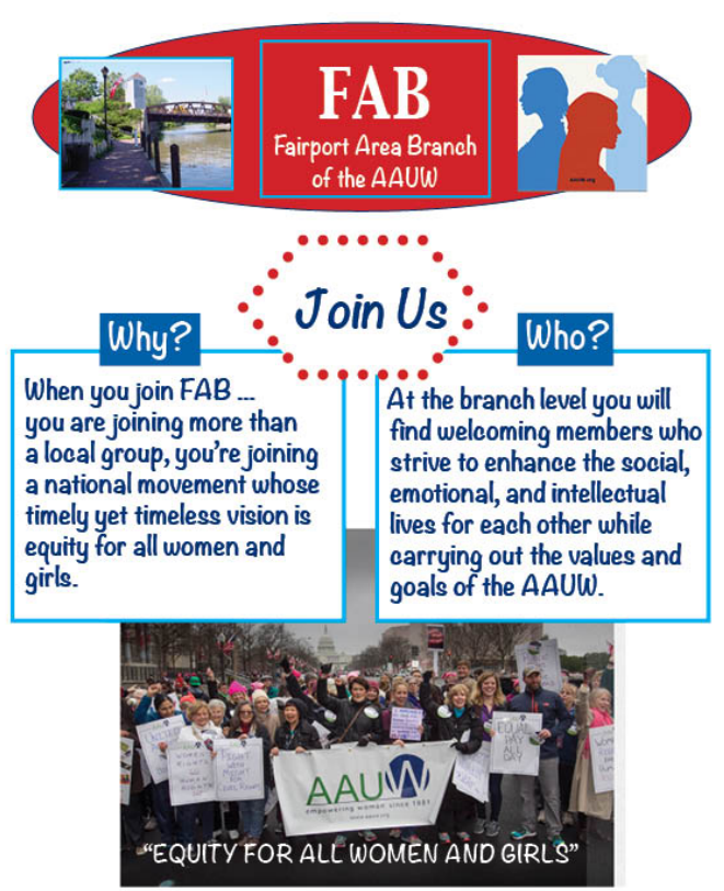 The Fairport Area Branch (FAB) is a small AAUW branch in western New York that maintains a steady membership of 30-35 individuals. Approximately half of our membership serves on our Executive Committee which convenes biannually. FAB hosts at least five mission-driven programs each year, focusing on topics relevant to women and girls such as education, legislation, gender equity, the arts, technology, medical research, and economic security.